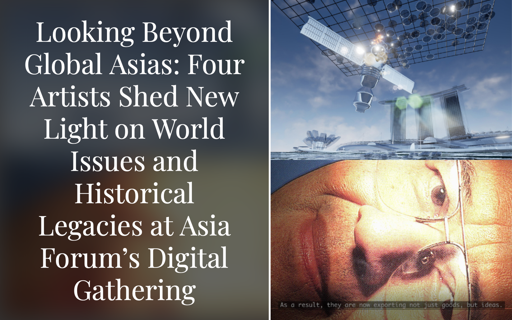 The Asia Forum for the Contemporary Art of Global Asias’ Fall Digital Gathering in November 2021 introduced a focus on the notion of liquidity—as in flux, movement, transition, and transformation—investigating the tectonic shifts in the geopolitical, socio-economic, and cultural landscape of Asia. From Singapore and China, to Hong Kong, and Indonesia, the presentations by Lawrence Lek, Ho Rui An, and Tita Salina and Irwan Ahmett, shed new light on historical legacies and present global concerns.
