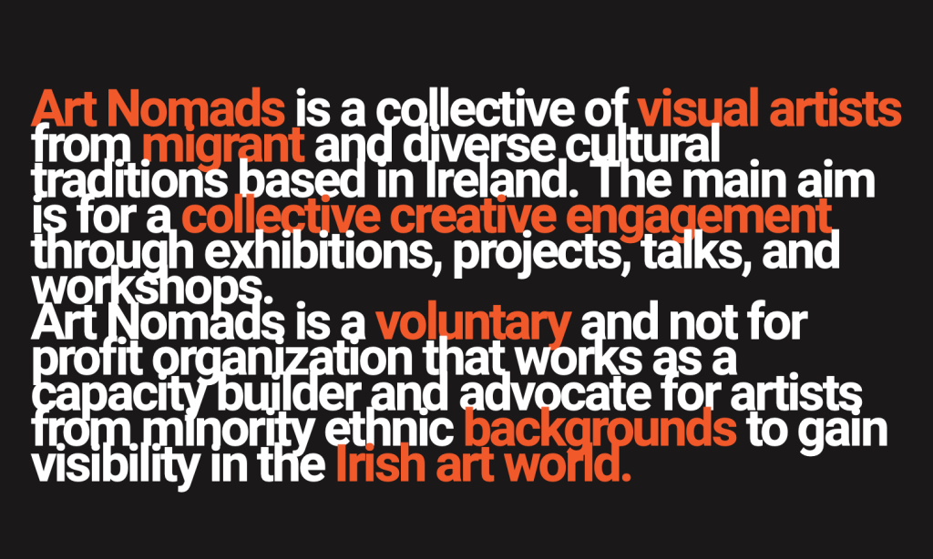 Art Nomads is a collective whose membership is made up of artists from Nigeria, South Africa, Kenya, India, Pakistan, Malaysia, Iran, Kurdistan, Syria, Poland and the UK. Their transcultural exchange and collective art practice is a reflection of them as immigrant artists from different nations, many fleeing from wars, insecurity as well as injustice from their respective nations to a rendezvous in the Republic of Ireland.