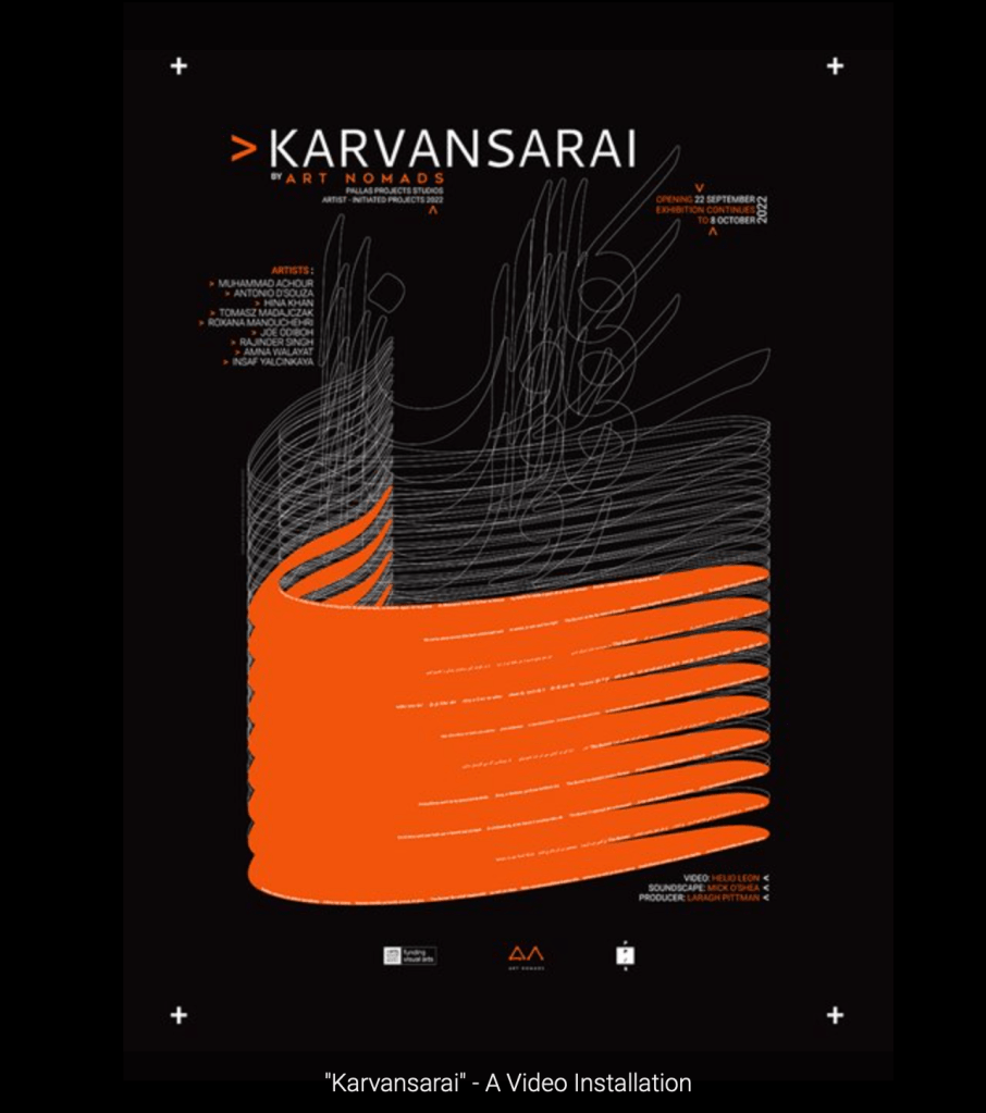 The artist makers Muhammad Achour, Antonio D’Souza, Hina Khan, Tomasz Madajczak, Roxana Manouchehri, Joe Odiboh, Rajinder Singh, Amna Walayat and Insaf Yalçinkaya who come from a range of cultural and dispersed global locations are also from a spectrum of art praxis; architecture, painting, movement based art, miniature painting, poetry, sculpture & video installation. Working with Spanish Irish-based filmmaker Helio León, Irish sound artist Mick O Shea and producer Laragh Pittman, Art Nomads’ new work ‘Karvanserai’ at Pallas Projects/Studios offers a meeting and resting place for migrants from the long and tough journeys of life. This work has come out of their Arts Council funded project Souk/Bazaar’s participatory process.
